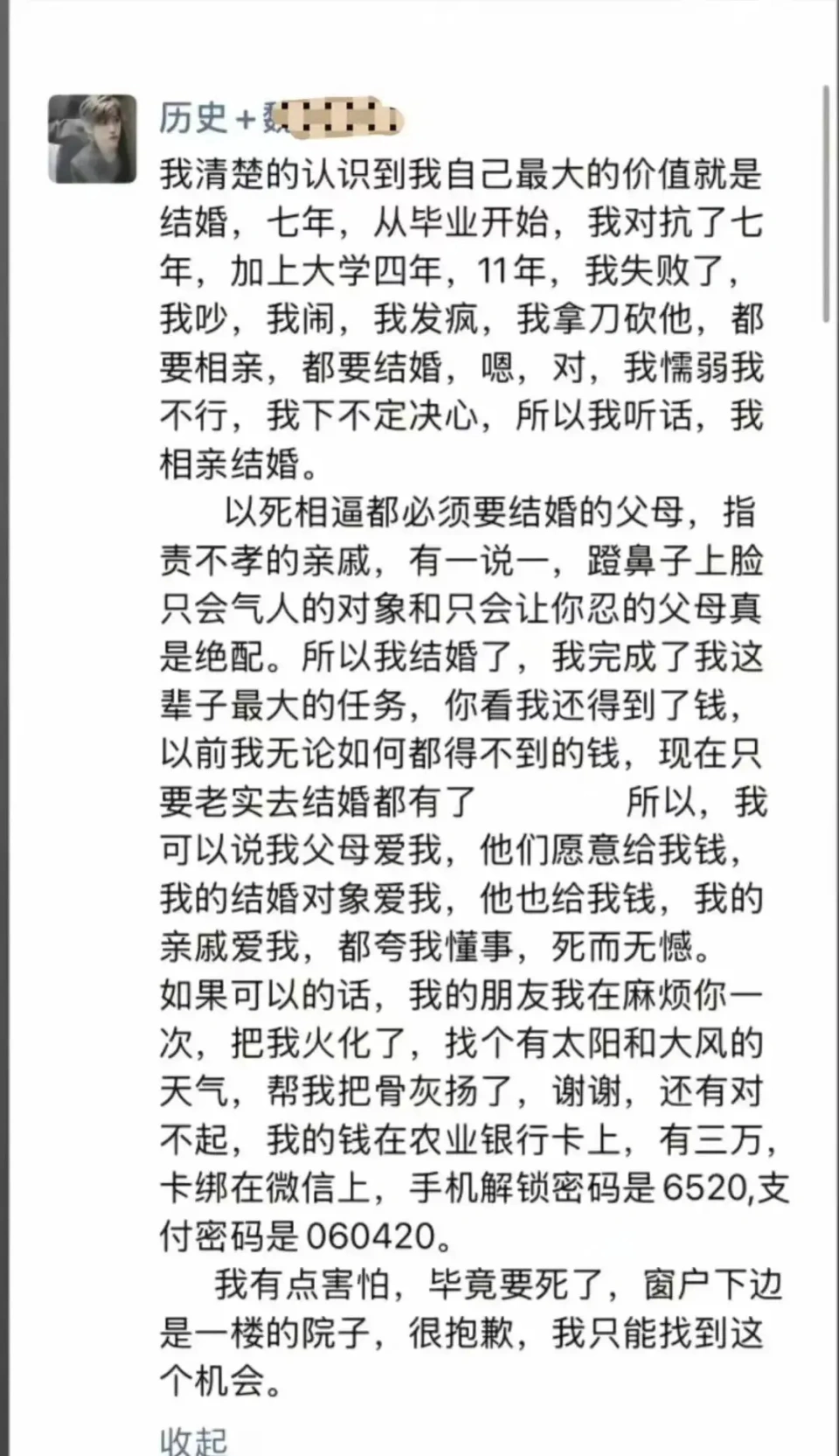 12月10日,河南鲁山县一名28岁高中女教师于新婚当天,从某小区7楼坠楼身亡。事发后,其所在学校及同学证实了她的教师身份。另有消息称,该女子生前曾在朋友圈表示“其实并不想结婚”。