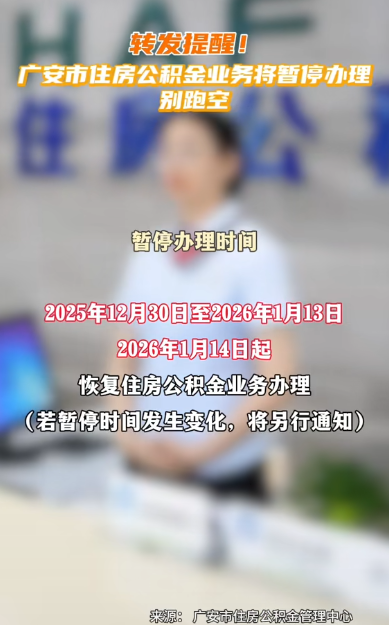 转发提醒!广安市住房公积金业务将暂停办理,市民千万别跑空!