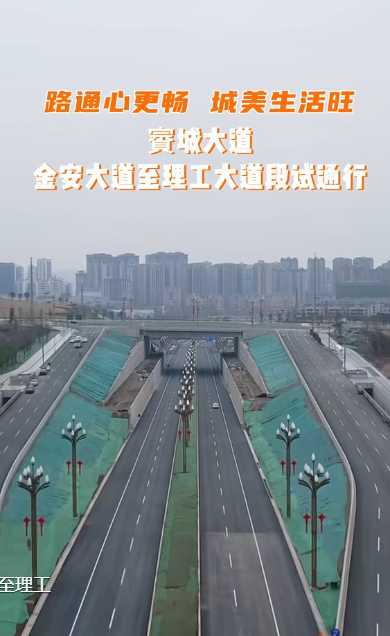 作为广安主城区连接西渝高铁广安东站的交通大动脉重要组成部分,賨城大道金安大道至理工大道段的试运行,不仅打通了城市内部的交通微循环,更完善了广安城市立体交通体系。该路段向西衔接城市核心商圈,向东直达广安理工学院,向南串联官盛新区及高铁片区,成为推动城市片区联动发展的重要纽带,既为广安理工学院的建设发展提供了高效的交通保障,也为沿线商业、产业集聚发展创造了有利条件,同时还将为 2026 年四川省运动会提供优质的交通配套服务。